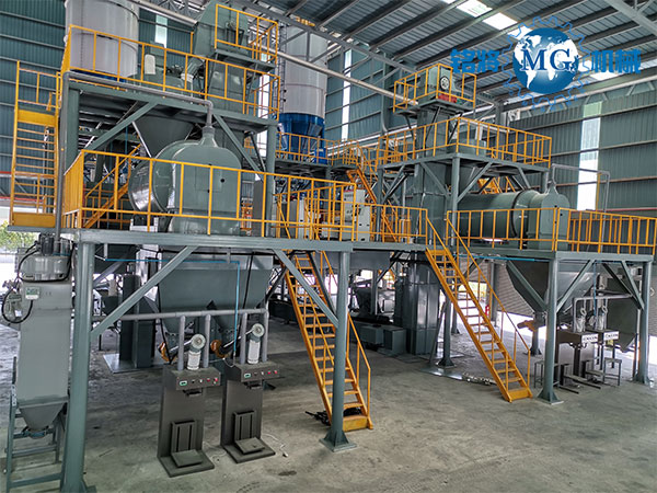 該套生產(chǎn)線在全自動干粉砂漿生產(chǎn)線的基礎(chǔ)上,增配針對;⒅槲锢硖匦詫iT研制的離心式滾筒混合機(jī)及高效專用體積打包機(jī)(敞口包裝機(jī)可選)。該套生產(chǎn)線效率高、產(chǎn)量大、適用性強(qiáng)、操作性好。該套設(shè)備實(shí)現(xiàn)多點(diǎn)除塵處理,工作環(huán)境好,有力保障員工身心健康,創(chuàng)造高效清潔的生產(chǎn)環(huán)境。