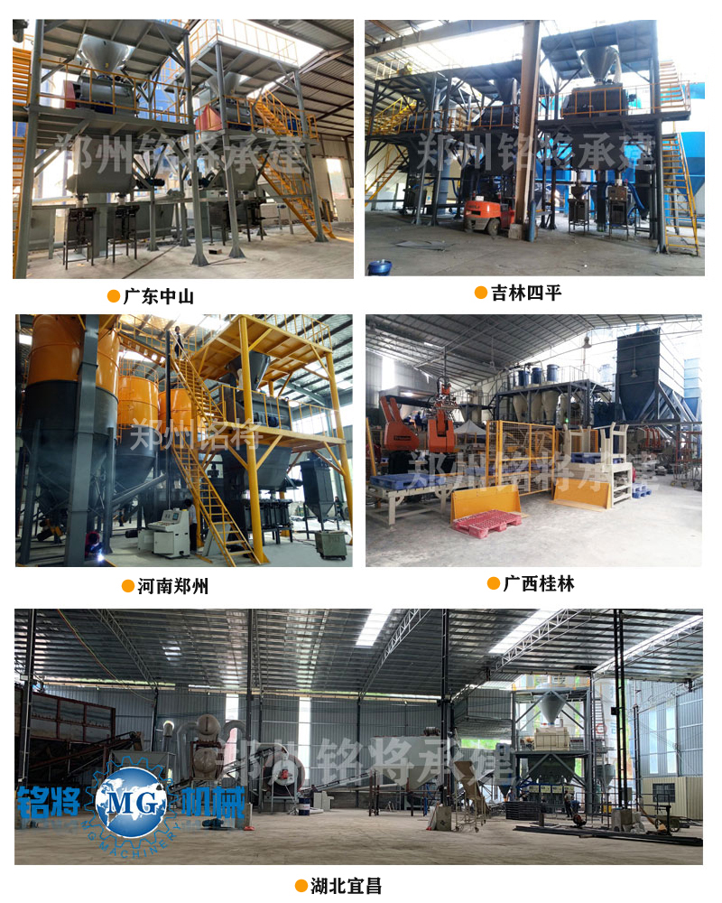 該生產(chǎn)線主要由原料儲(chǔ)存系統(tǒng)、配料稱重系統(tǒng)、輸送系統(tǒng)、混合系統(tǒng)、氣相平衡系統(tǒng)、包裝系統(tǒng)及除塵系統(tǒng)構(gòu)成。主控制系統(tǒng)依據(jù)選定工藝配方下達(dá)生產(chǎn)指令,系統(tǒng)自動(dòng)從儲(chǔ)料倉中按配比提取原料,原料經(jīng)配重后依次進(jìn)入待混倉及無重力高效混合機(jī),實(shí)現(xiàn)快速混合作業(yè)(3-5分鐘)。達(dá)到混合精度要求后,成品砂漿被輸送至具備二次混合功能的成品倉,進(jìn)入自動(dòng)包裝系統(tǒng),大大提高產(chǎn)出效率。