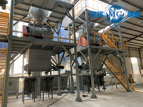 該生產(chǎn)線主要由原料儲(chǔ)存系統(tǒng)、配料稱重系統(tǒng)、輸送系統(tǒng)、混合系統(tǒng)、氣相平衡系統(tǒng)、包裝系統(tǒng)及除塵系統(tǒng)構(gòu)成。主控制系統(tǒng)依據(jù)選定工藝配方下達(dá)生產(chǎn)指令,系統(tǒng)自動(dòng)從儲(chǔ)料倉中按配比提取原料,原料經(jīng)配重后依次進(jìn)入待混倉及無重力高效混合機(jī),實(shí)現(xiàn)快速混合作業(yè)(3-5分鐘)。達(dá)到混合精度要求后,成品砂漿被輸送至具備二次混合功能的成品倉,進(jìn)入自動(dòng)包裝系統(tǒng),大大提高產(chǎn)出效率。